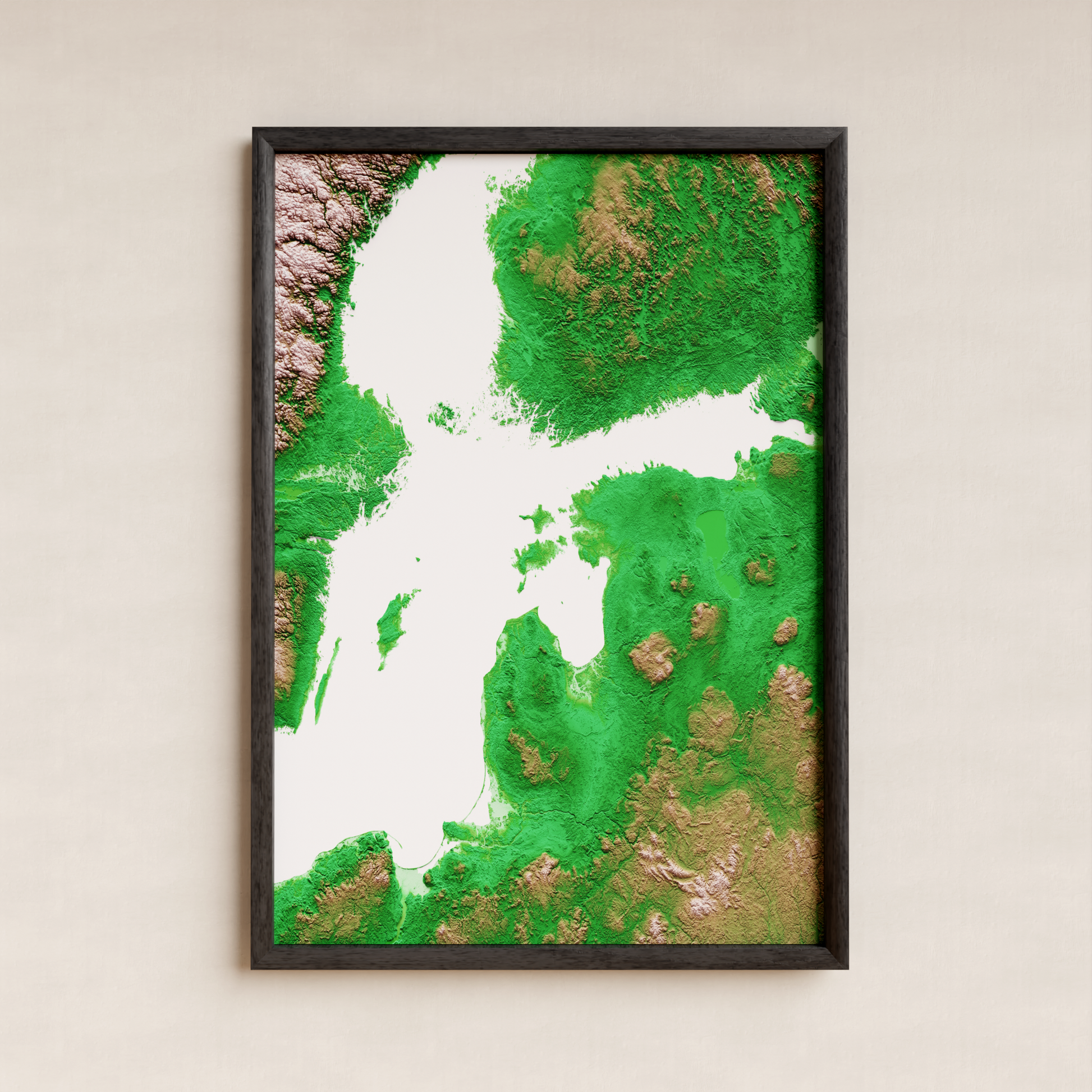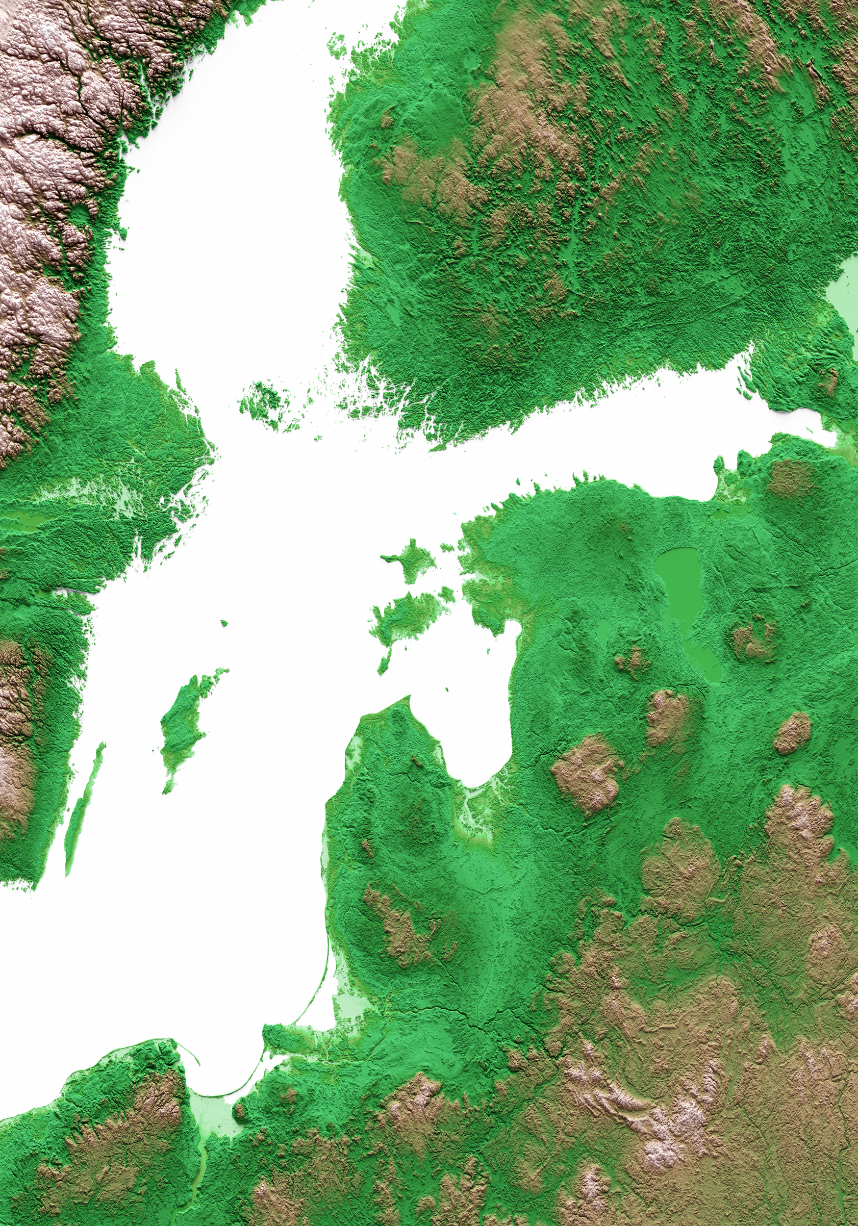 Nuestra impresión clásica de mapa de relieve presenta un diseño minimalista que resalta la topografía natural y las elevaciones de la tierra que rodea el Mar Báltico.La paleta de colores abarca desde exuberantes verdes hasta ricos marrones y blancos, aumentando con la altura, lo que complementa sin esfuerzo el mar blanco y el mar blanco.Esta elegante combinación de colores y elementos de diseño da vida a la impresionante geografía de la región del mar Báltico.