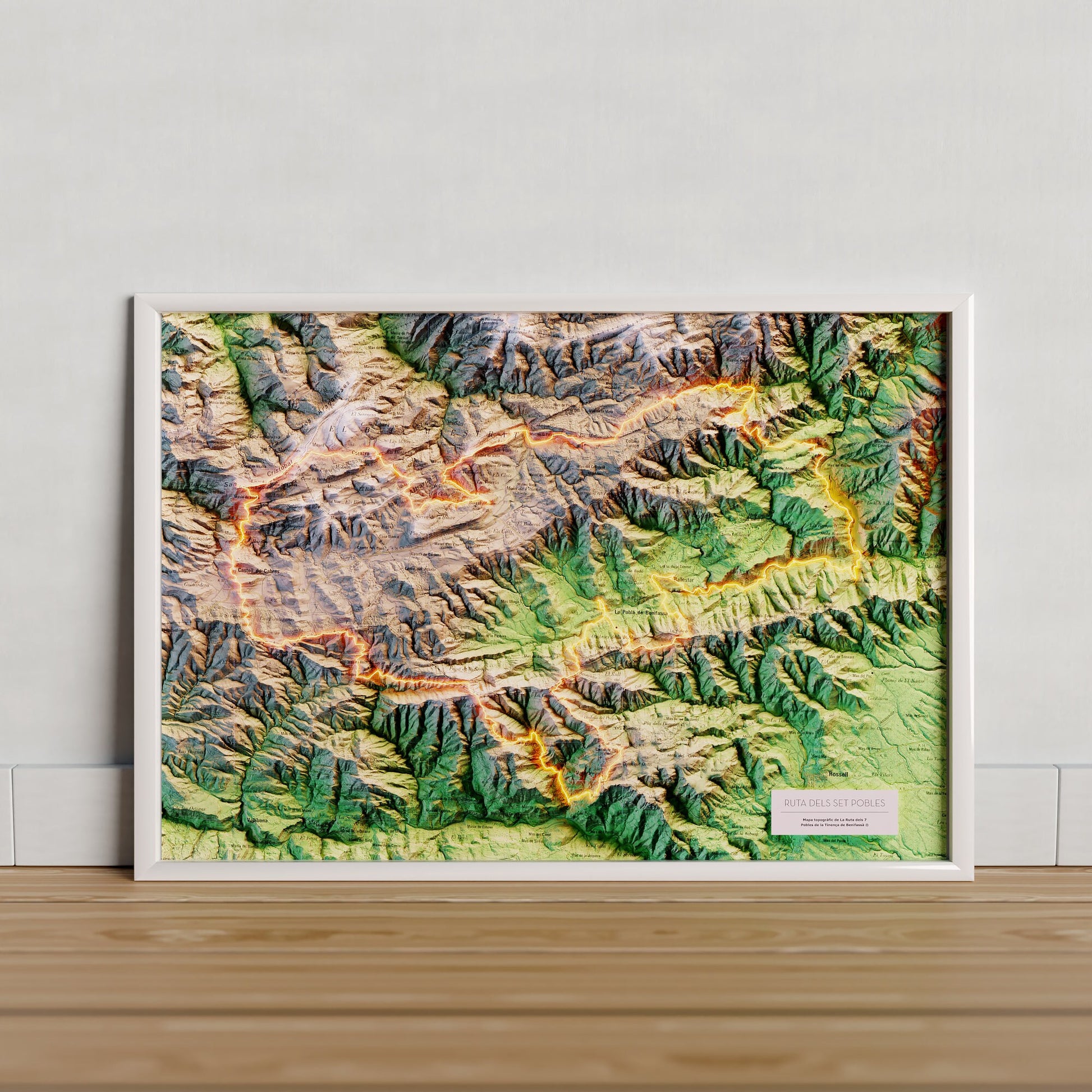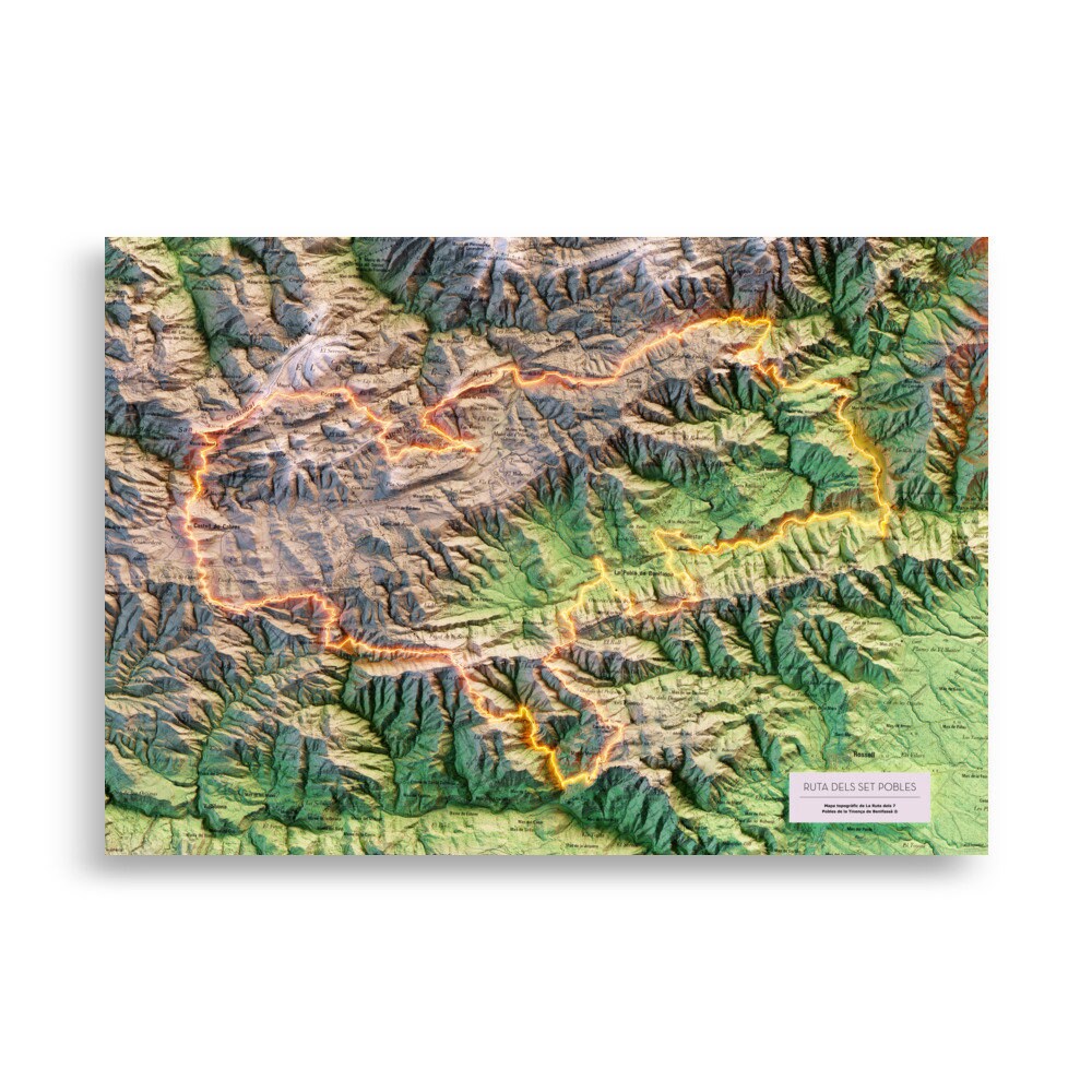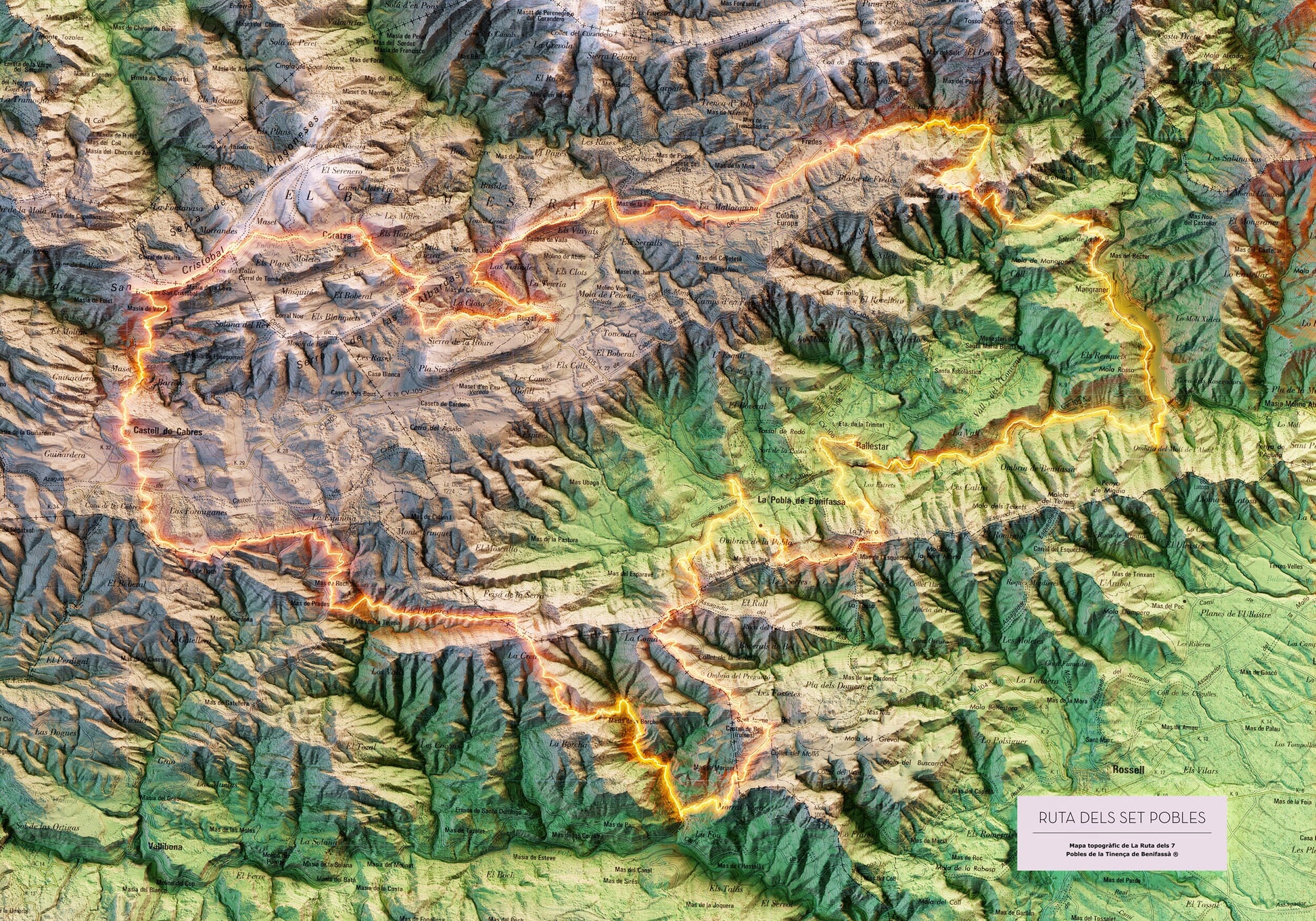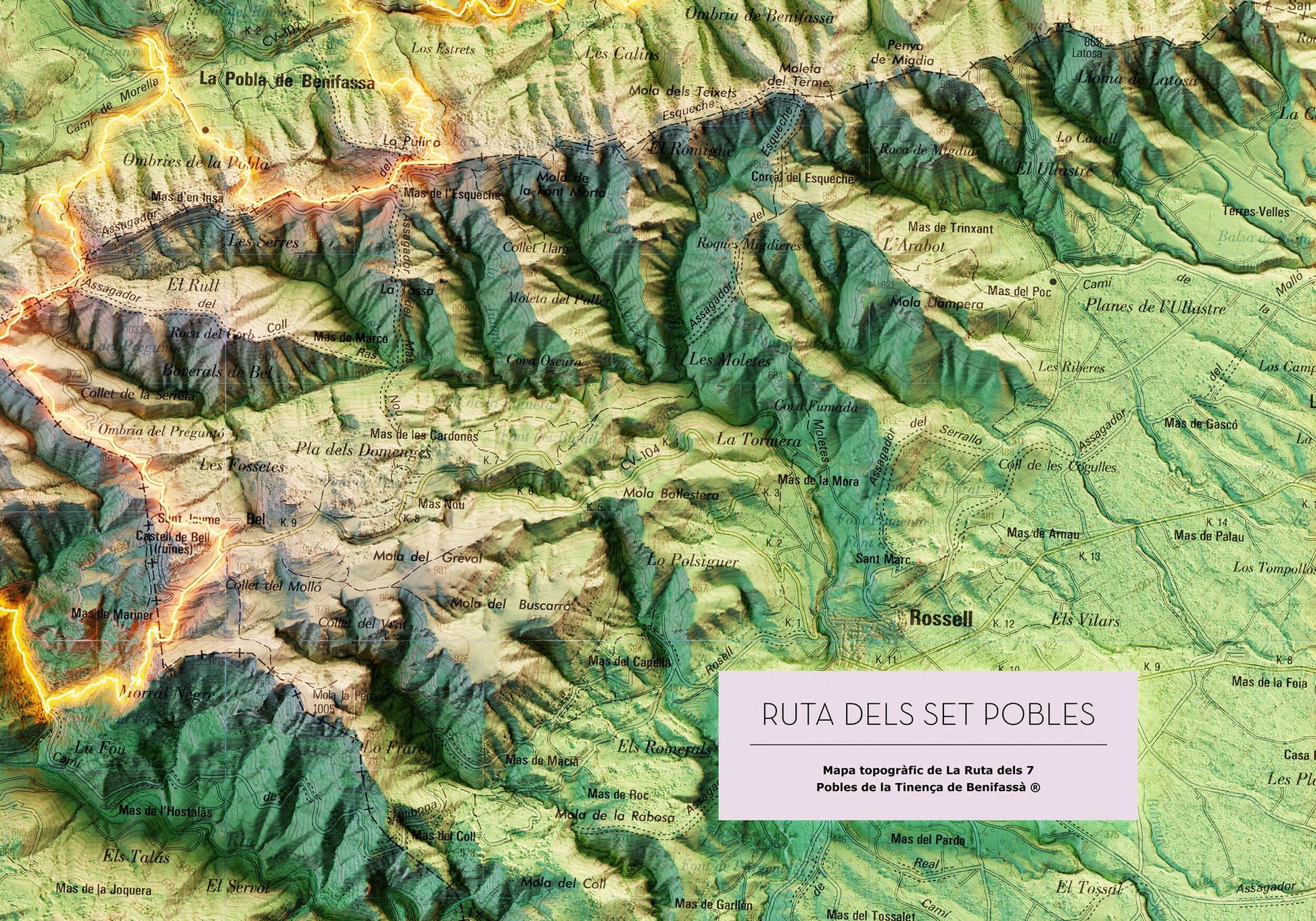 Mapa topográfico en color del recorrido de els 7 Pobles de la Tinença de Benifassà.
