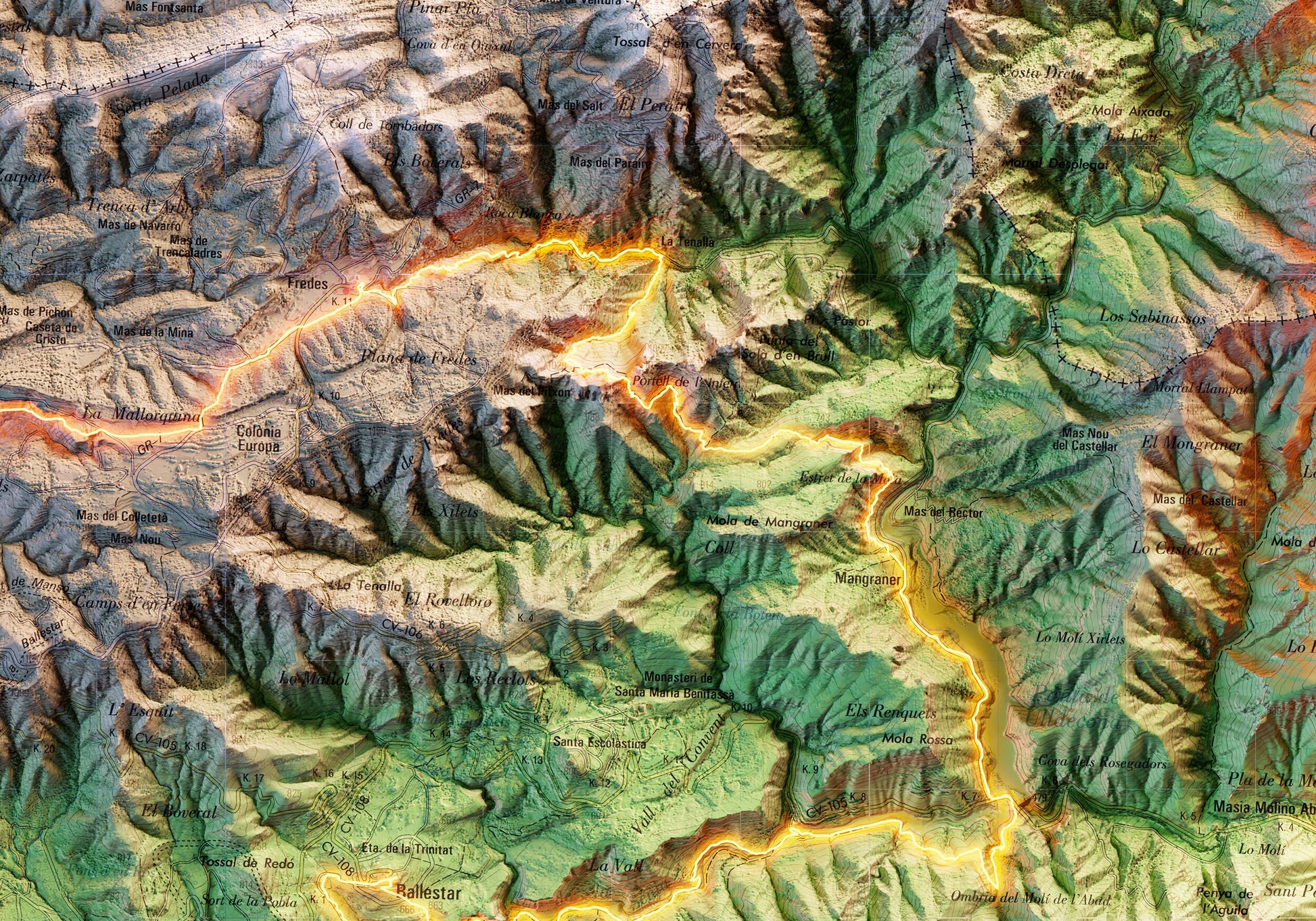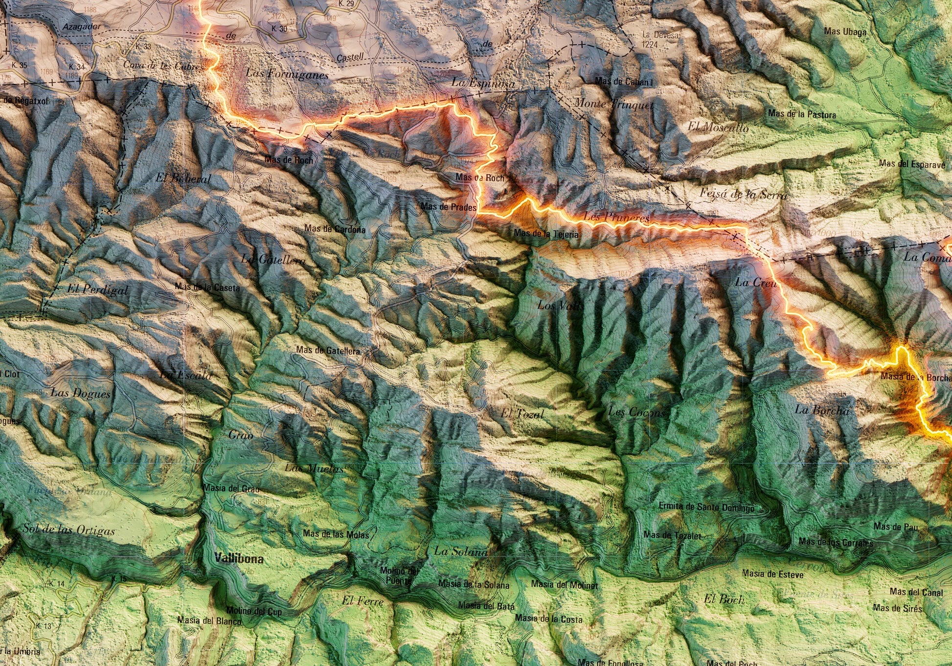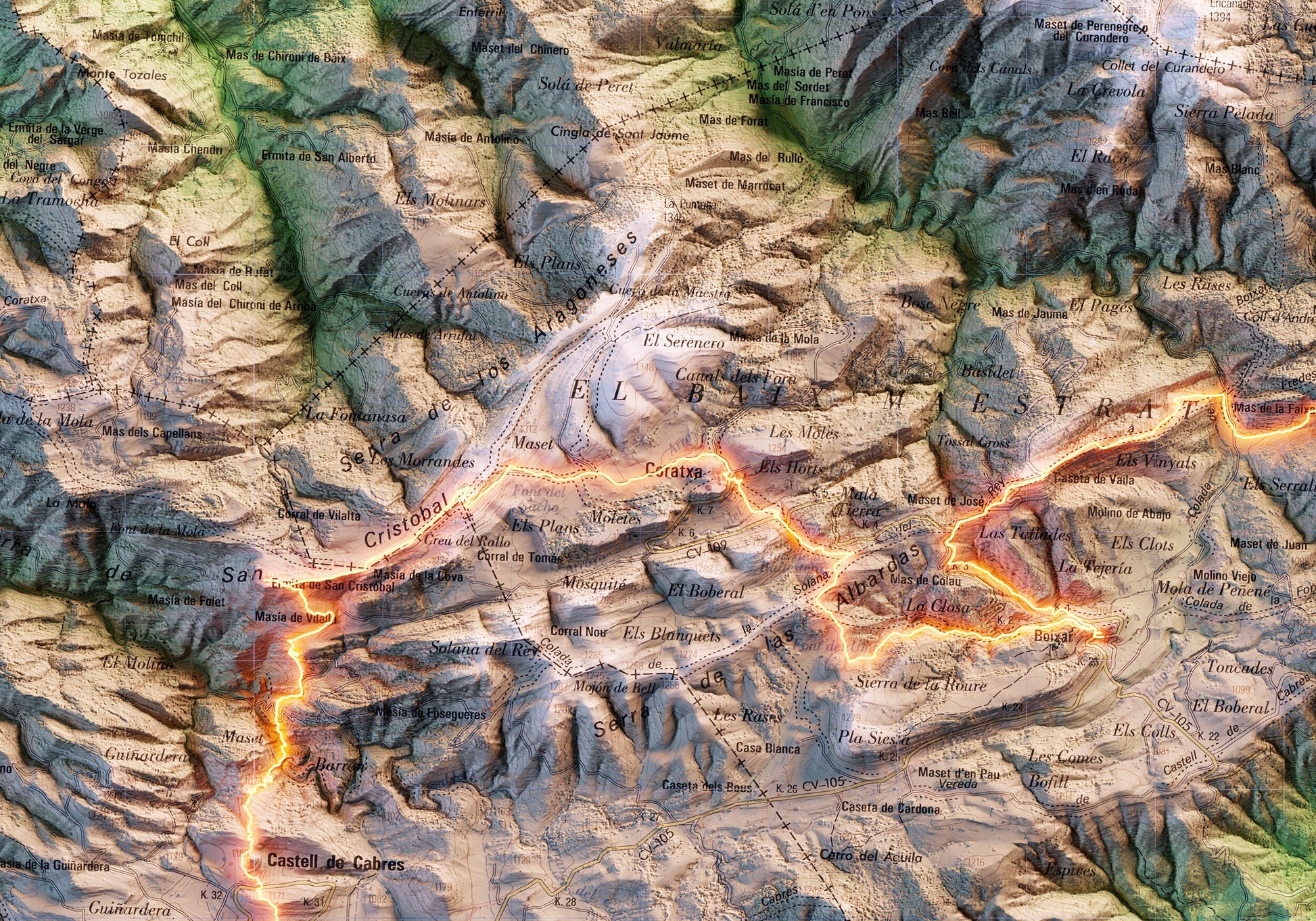 Mapa topográfico en color del recorrido de els 7 Pobles de la Tinença de Benifassà.