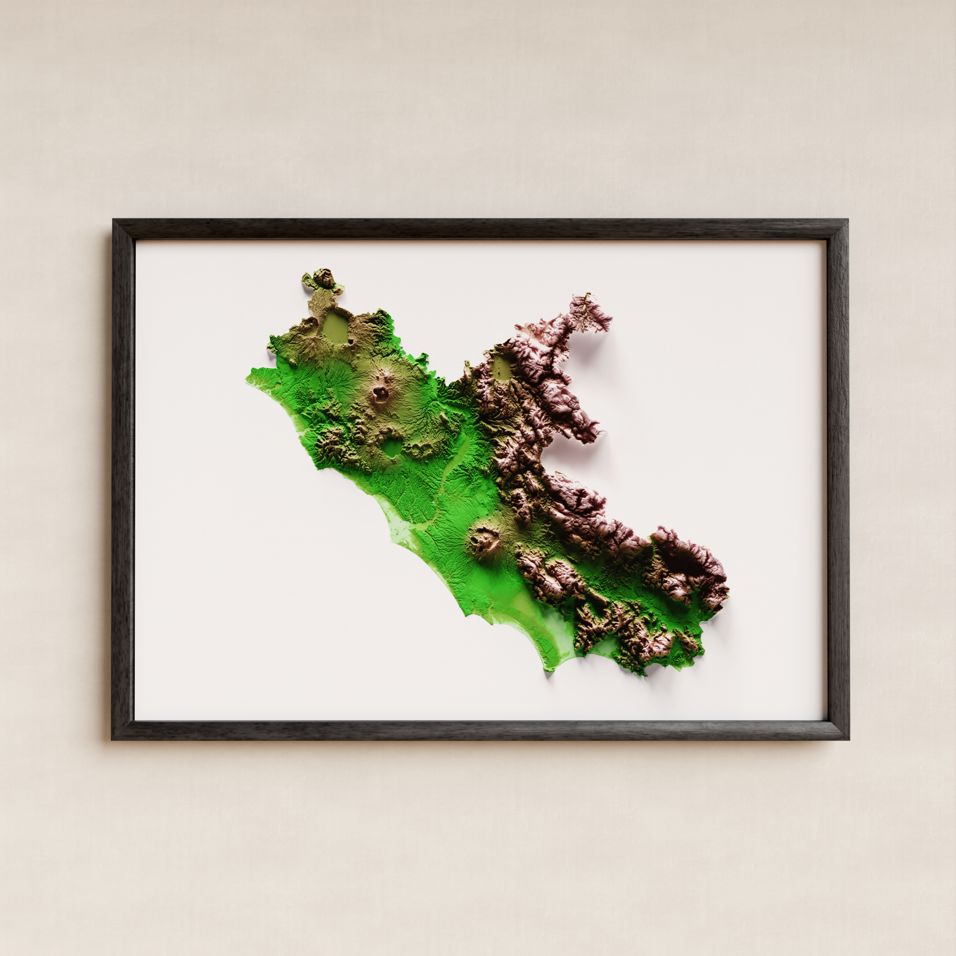 Descubra las características geográficas encantadoras de Lazio con esta clásica impresión de mapa de relieve.Desde las impresionantes montañas Apennine hasta la costa tirreniana bañada por el sol, este diseño minimalista pero atractivo captura la esencia de la topografía de Lazio.Perfecto para la decoración del hogar u oficina, o como un regalo sincero, deje que esta exquisita impresión lo sumerja en el esplendor de la región de Lazio.