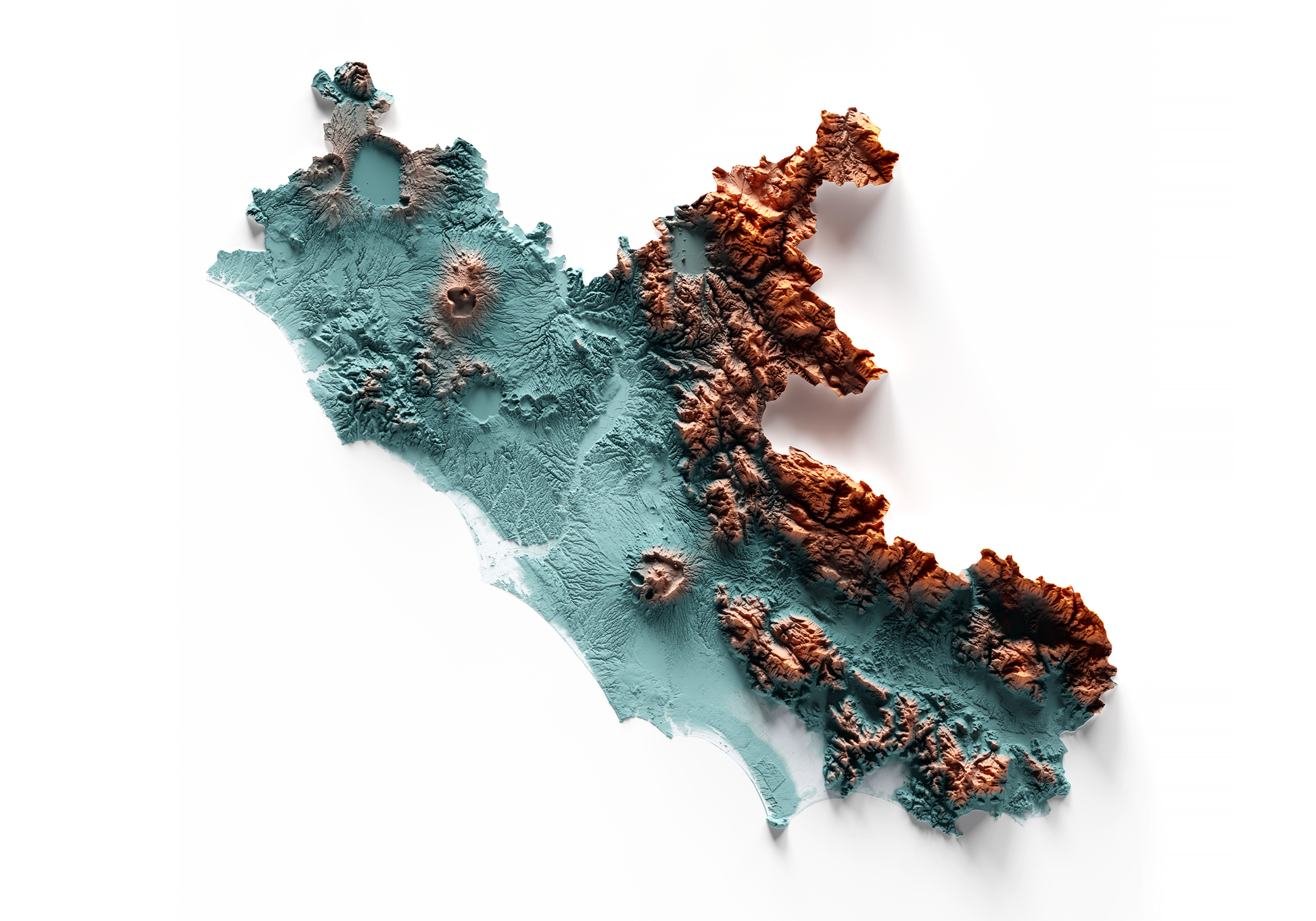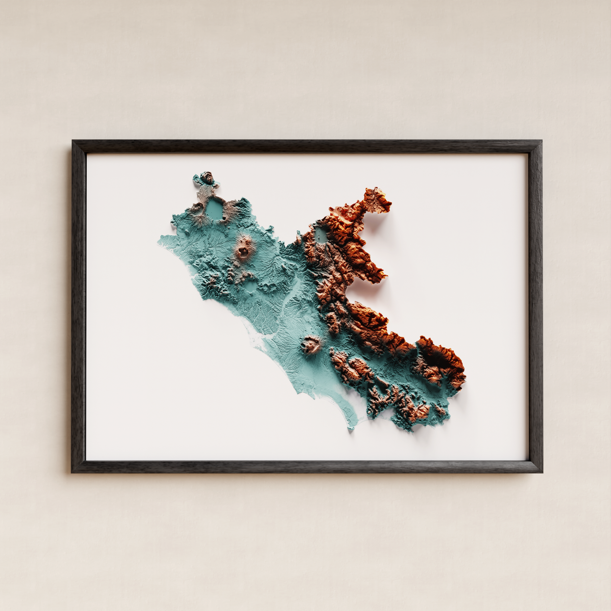Explore las características geográficas intrigantes de Lazio con esta impresión de mapa de relieve de contraste.Desde el impresionante Monti della Laga hasta las fascinantes pantanos pontinos, este diseño minimalista pero cautivador muestra la topografía de Lazio de una manera fresca y atractiva.Ideal para la decoración moderna de la casa u oficina, o como un regalo memorable, deje que esta impresión sorprendente lo transporte al corazón de la región de Lazio.
