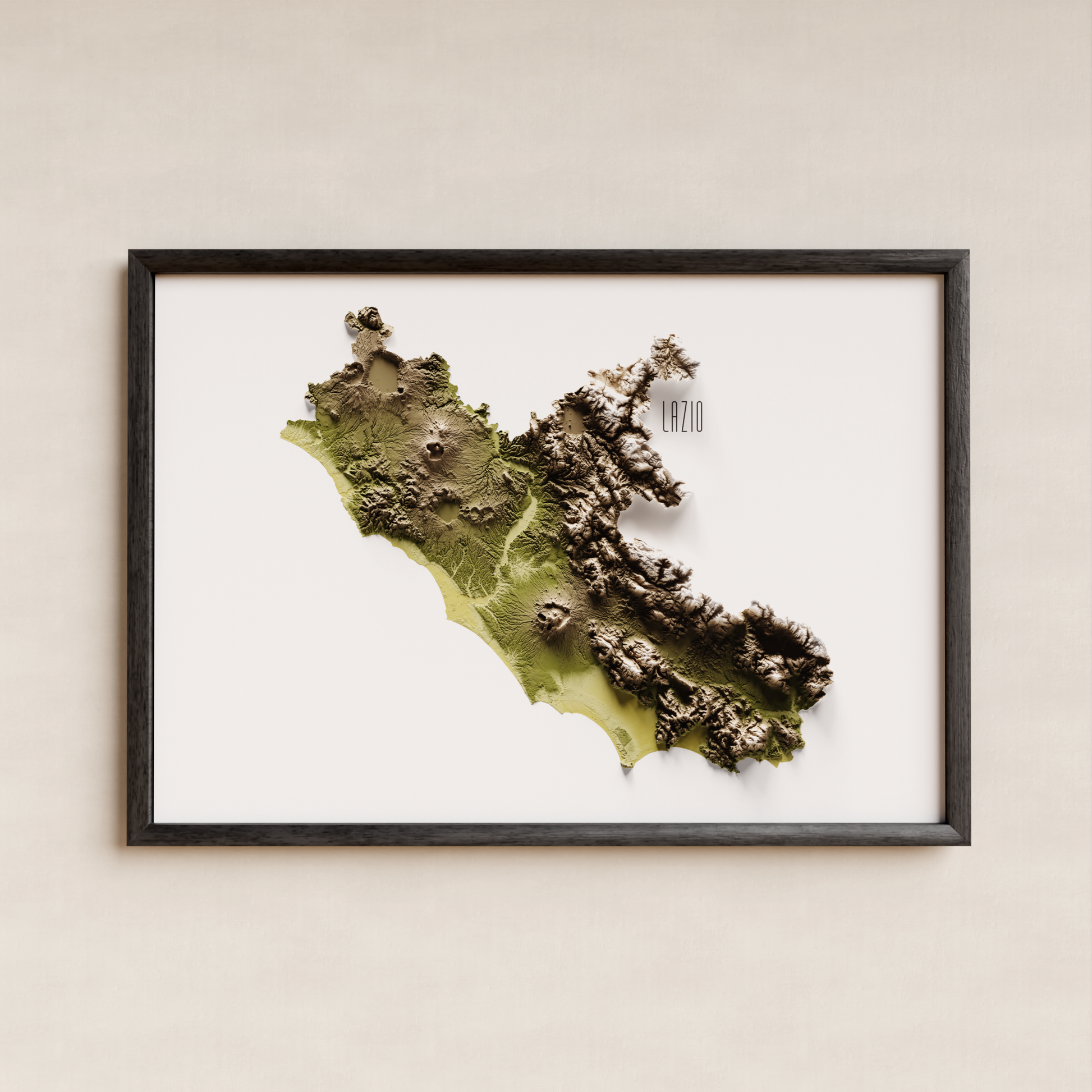 Experimente el encanto de las dramáticas características geográficas de Lazio con esta impresión de mapa de relieve terrestre.Desde las encantadoras colinas de Sabine hasta el fascinante lago Bolsena, la topografía de Lazio está bellamente capturada en este diseño minimalista pero cautivador.La adición perfecta a cualquier hogar u oficina, o un regalo reflexivo para un ser querido, deje que este impresionante impreso lo transporte al corazón del paisaje de Lazio.