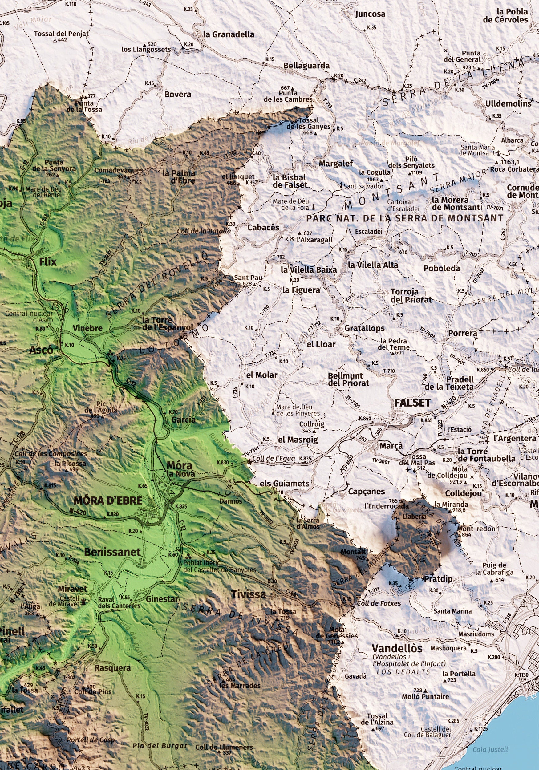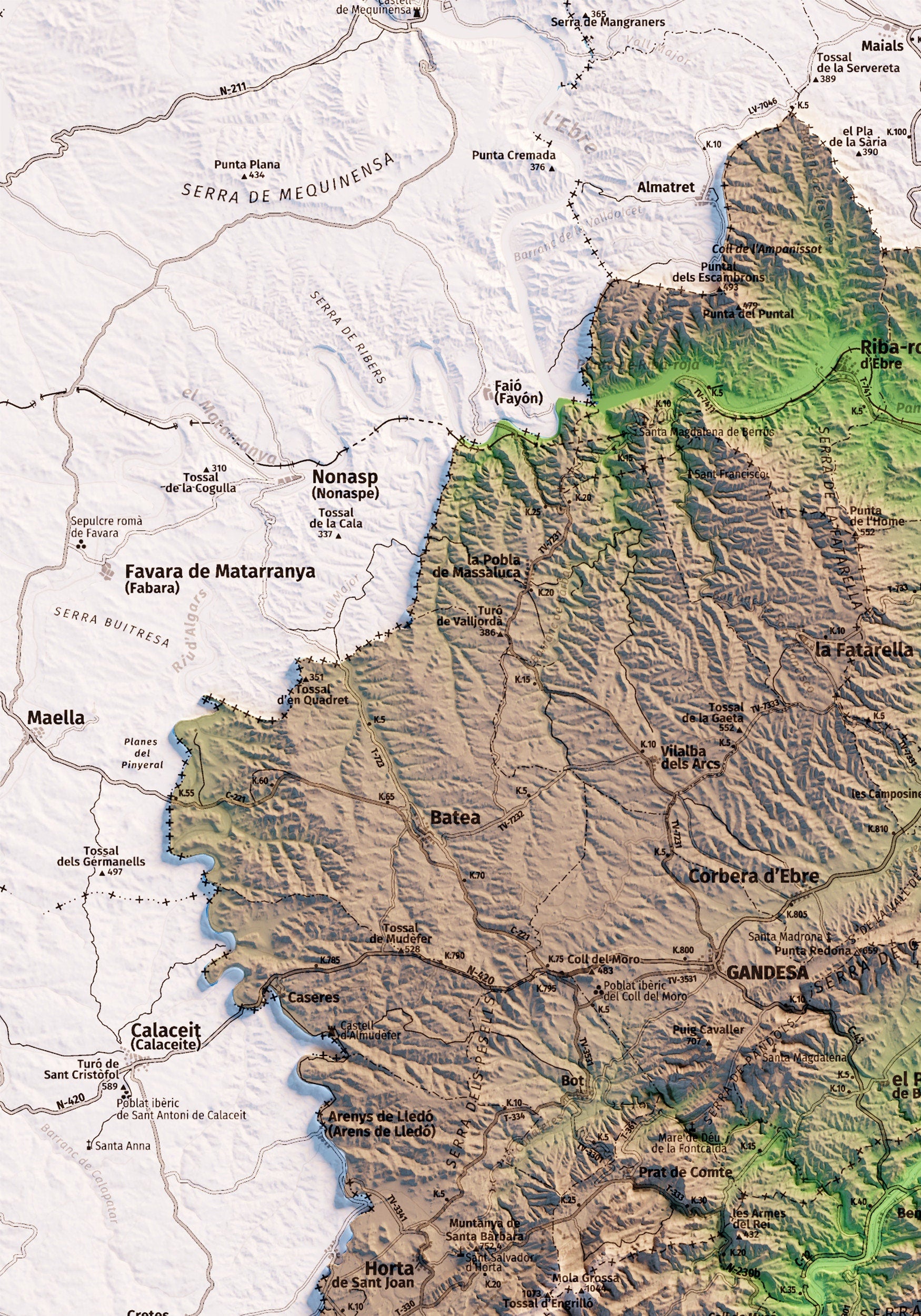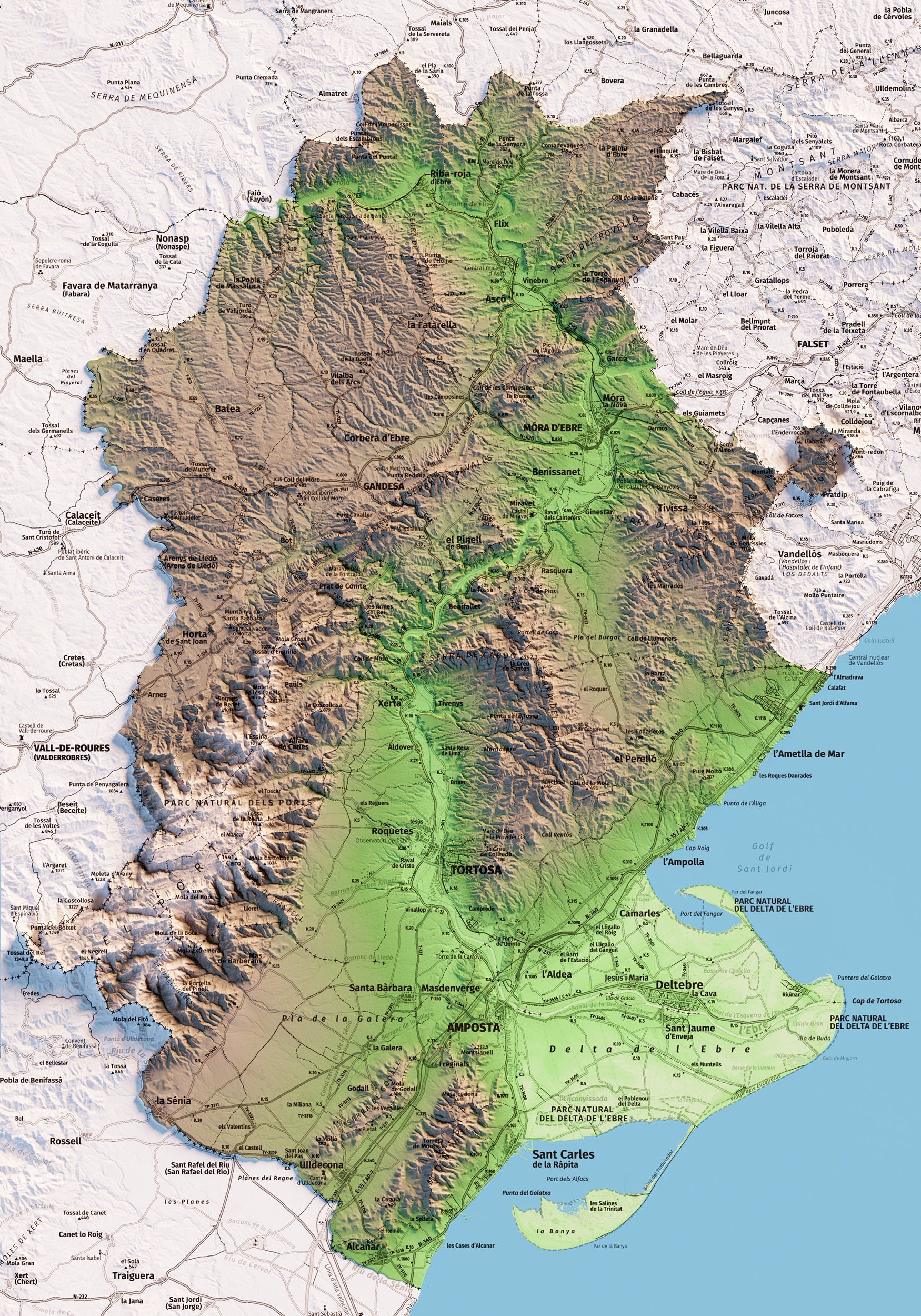 Mapa topográfico en color de la veguería de les Terres de l'Ebre.