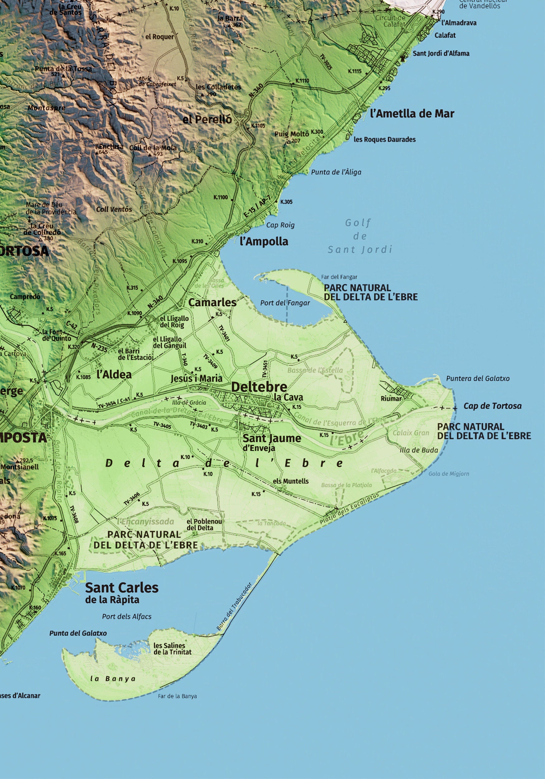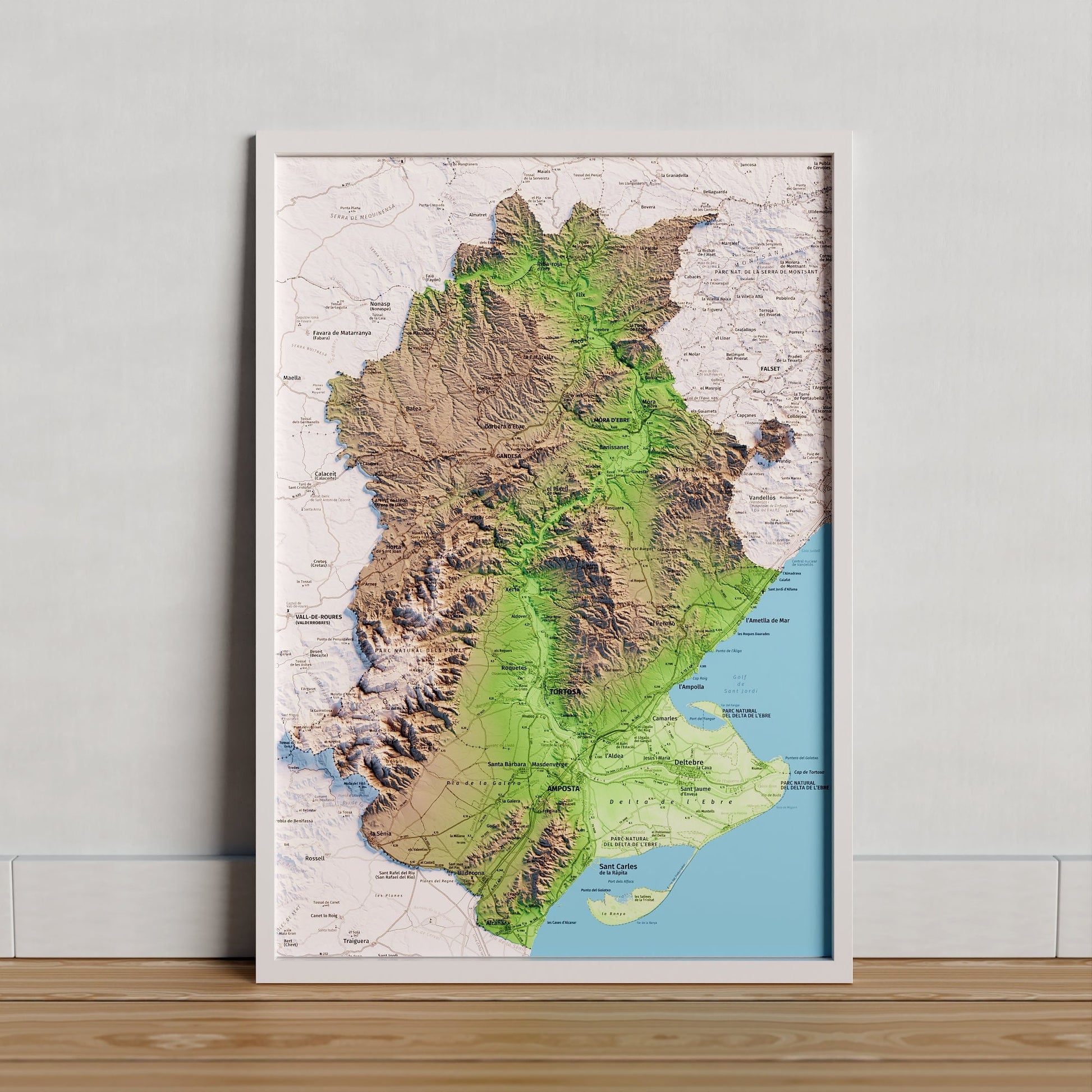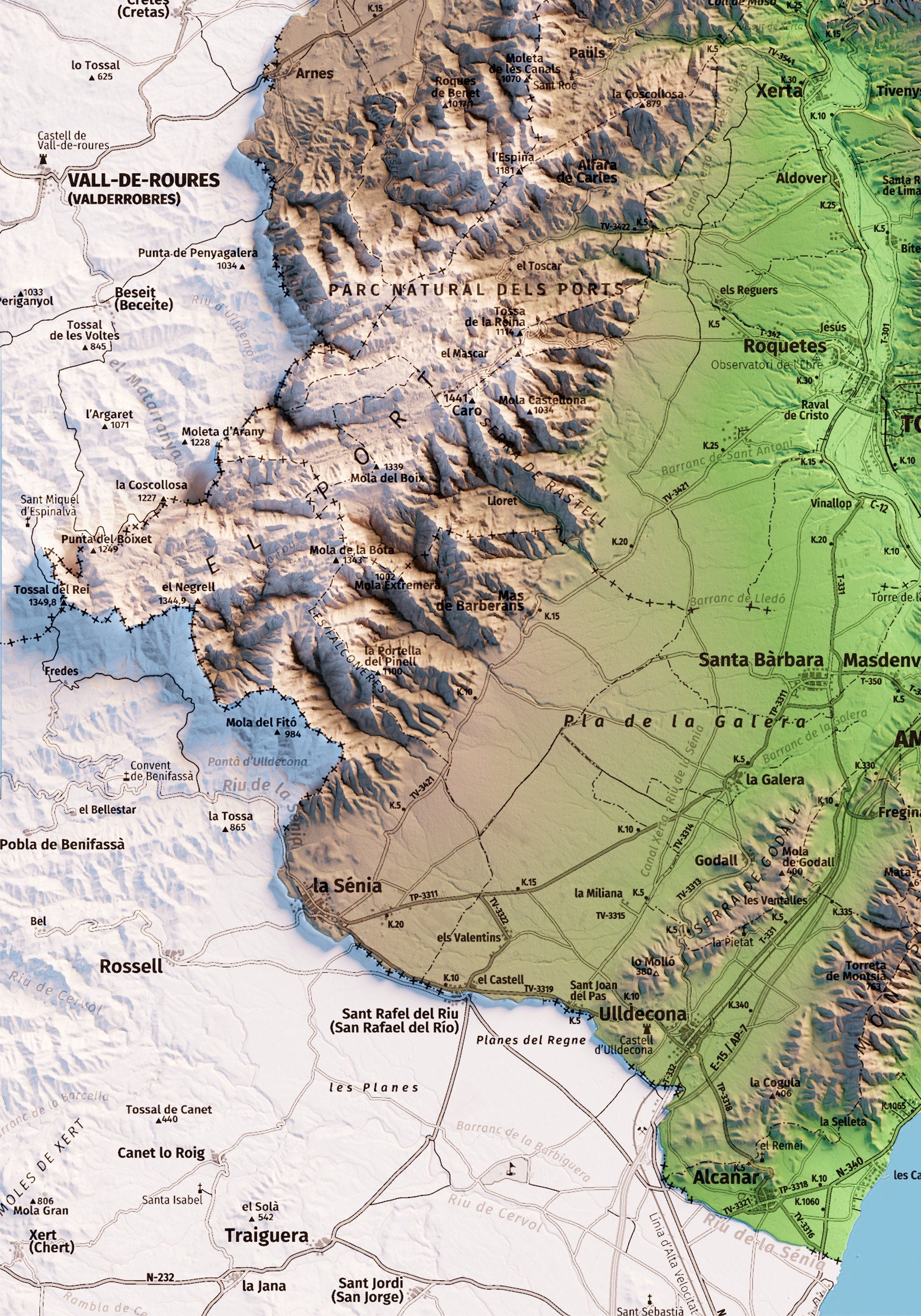 Mapa topográfico en color de la veguería de les Terres de l'Ebre.