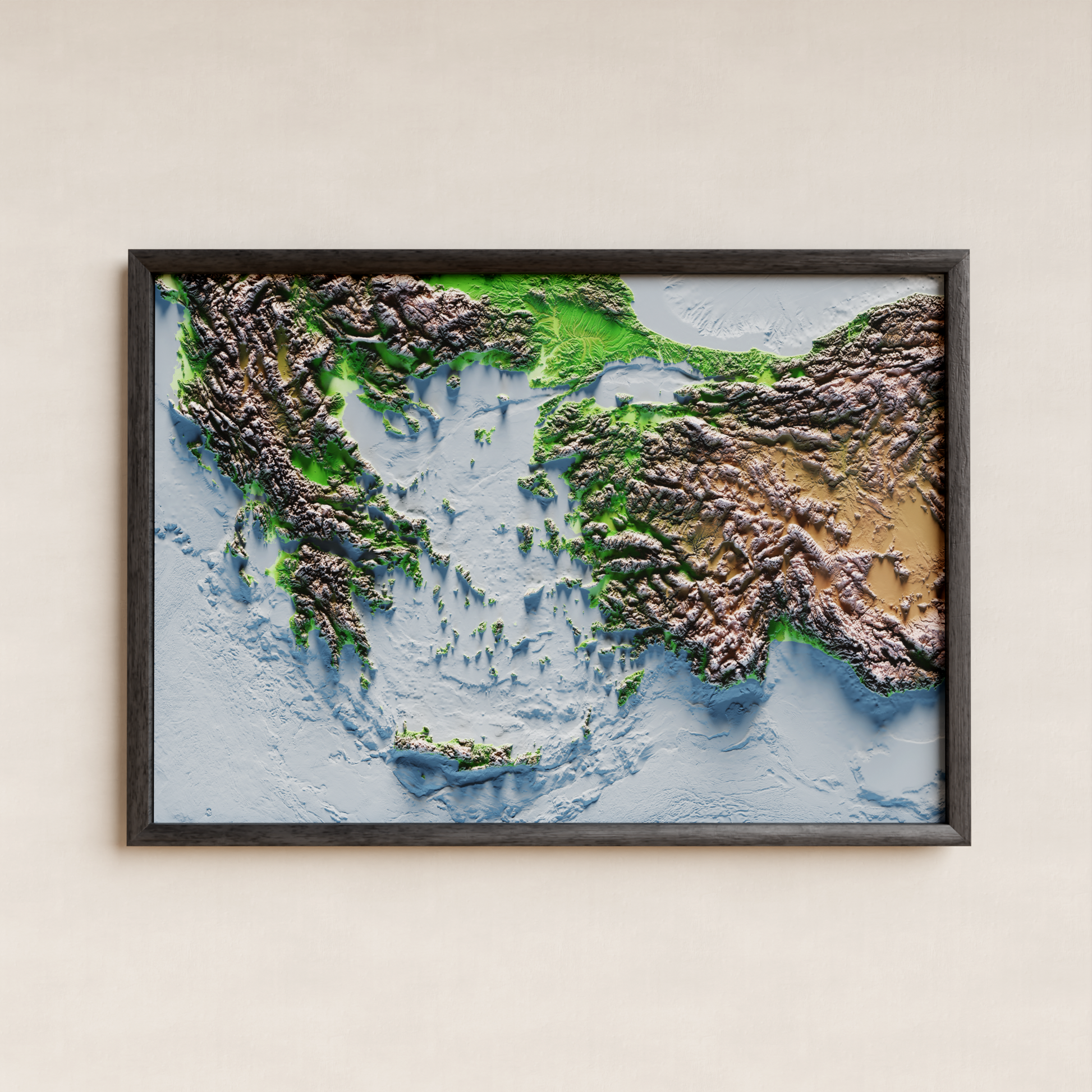 La fascinante geografía del Mar Egeo, desde su atractiva costa y islas bañadas por el sol hasta sus aguas cristalinas e historia antigua, se presenta bellamente en este clásico mapa de alivio con estampado con batimetría de mar azul.El cautivador encanto de esta región mediterránea encenderá su pasión por los viajes y servirá como un recordatorio constante de las maravillas que posee nuestro mundo.Sumérgete en la cautivadora belleza de los tesoros naturales e históricos del Mar Egeo con esta elegante y sofisticada pieza de arte de los mapas de Trobart.