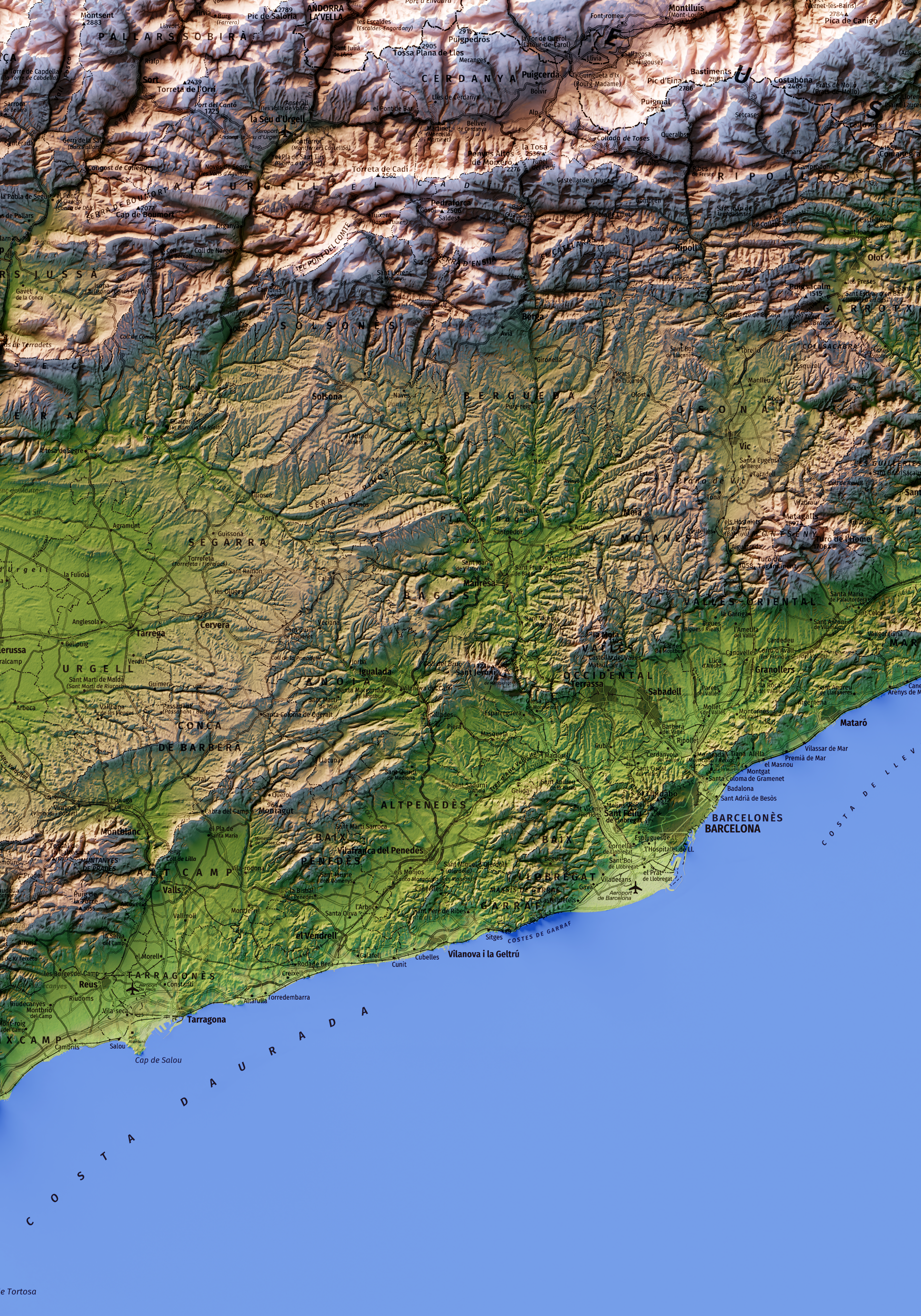 Mapa topográfico en color del Principat de Catalunya con el mar azul.