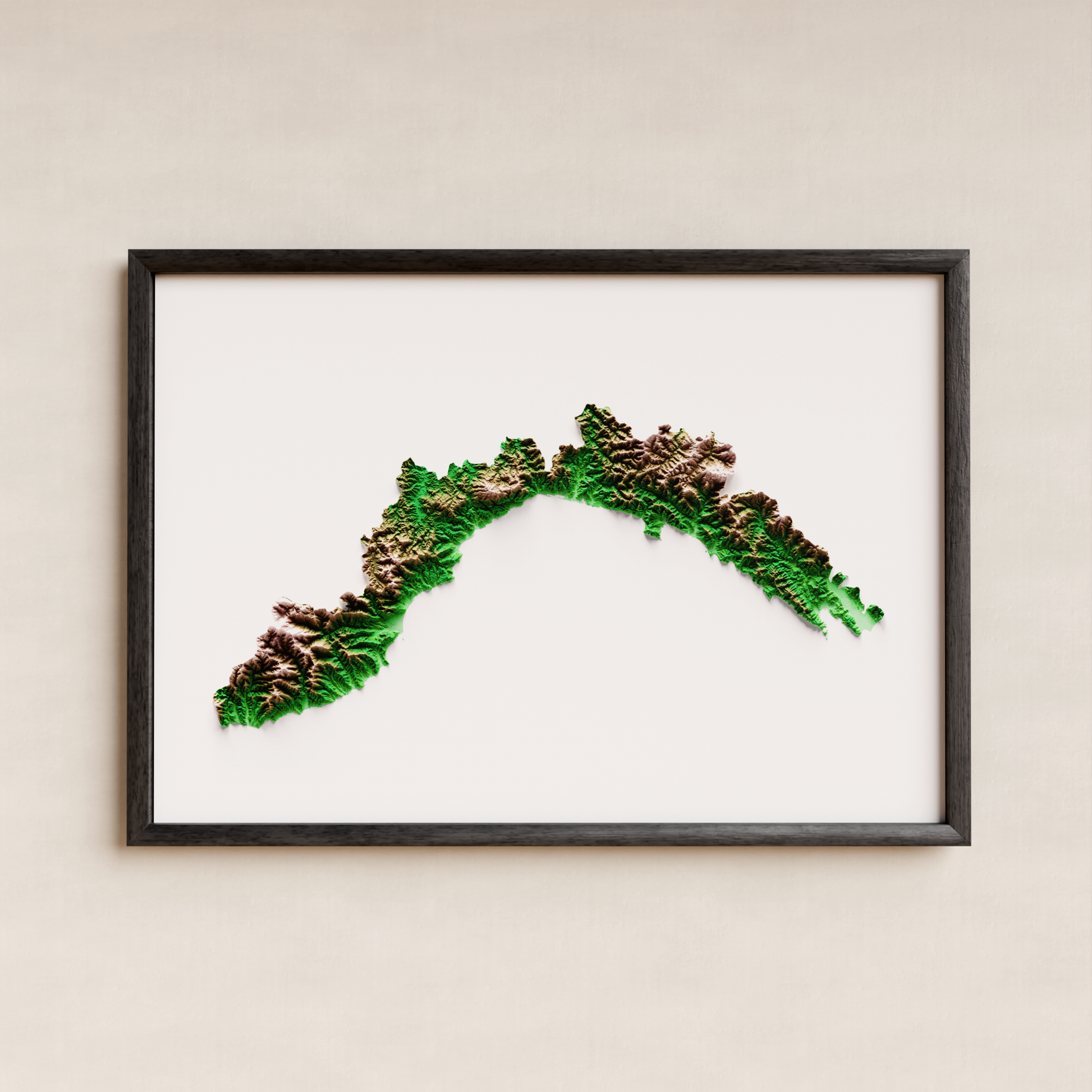 Nuestra impresión clásica de mapa de relieve presenta un diseño minimalista con una paleta de colores sofisticada, desde verduras y marrones suaves hasta blancos nítidos, destacando las diferentes elevaciones a través de la liguria.El mar, renderizado en un blanco virgen, mejora aún más la elegancia del mapa, por lo que es una adición excepcional a cualquier espacio interior.