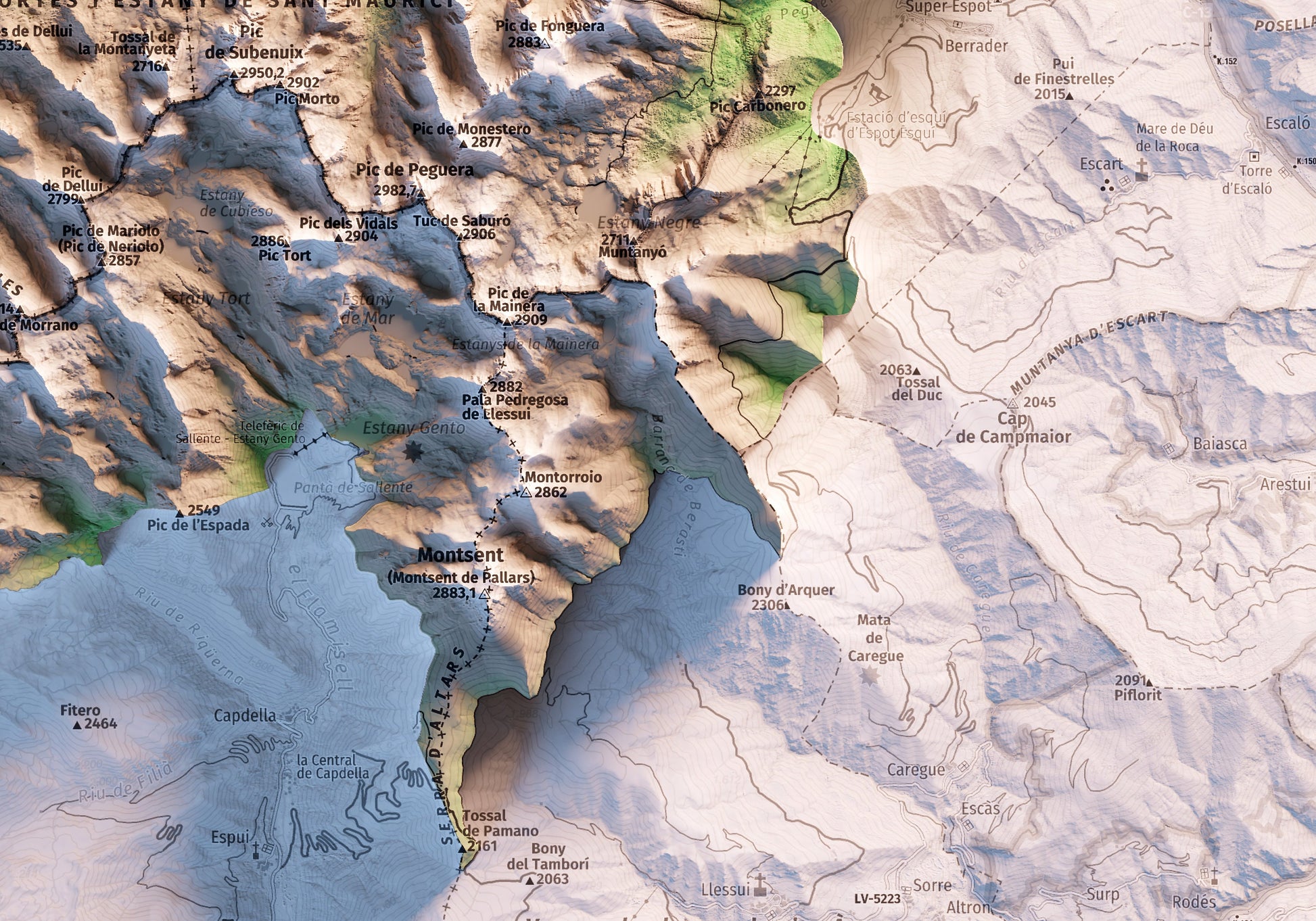 Mapa topográfico en color del parque nacional d'Aigüestortes i Estany de Sant Maurici y sus alrededores.