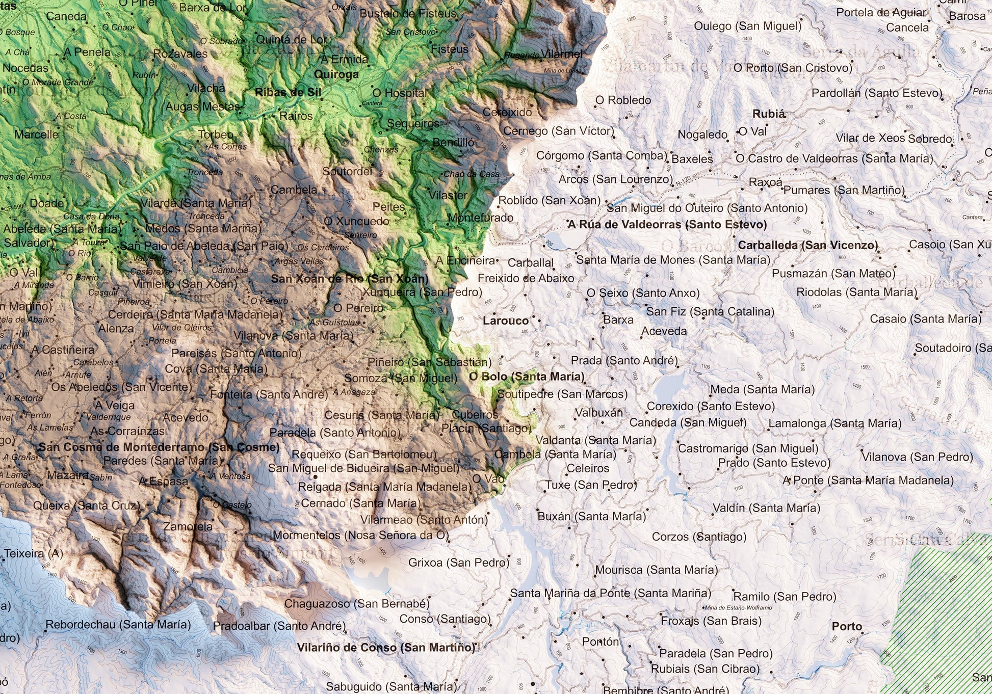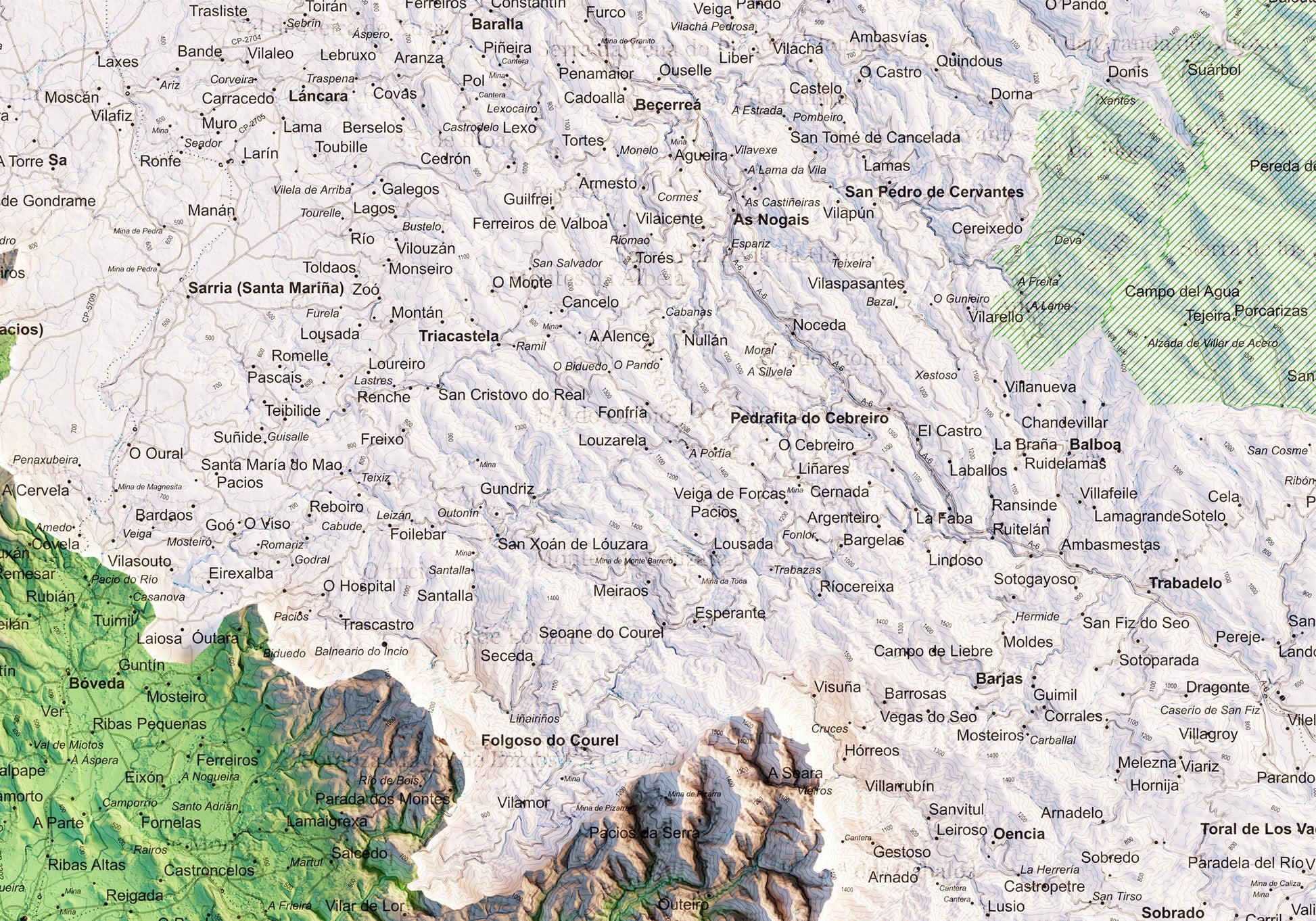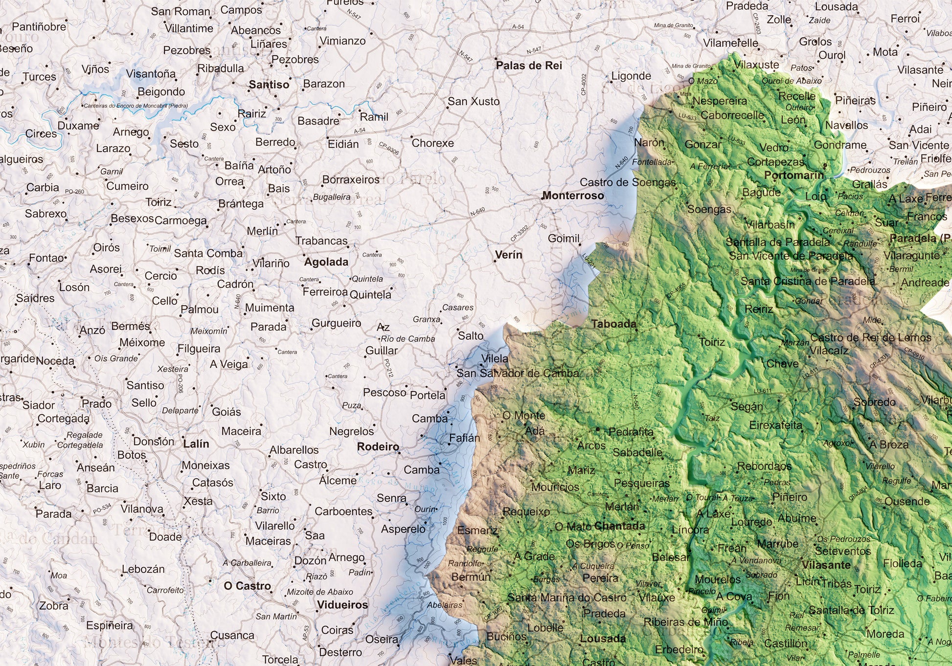 ✪ Aunque el sombreado que genera el efecto 3D nos permite crear unas magníficas piezas de arte visual, puede interferir con el texto del propio mapa. Especialmente en zonas de montaña el texto puede no ser legible. Los mapas con efecto 3D son perfectos para decorar pero no están diseñados para usarse como referencia o para ser consultados a corta distancia como se haría con un atlas o un mapa digital.