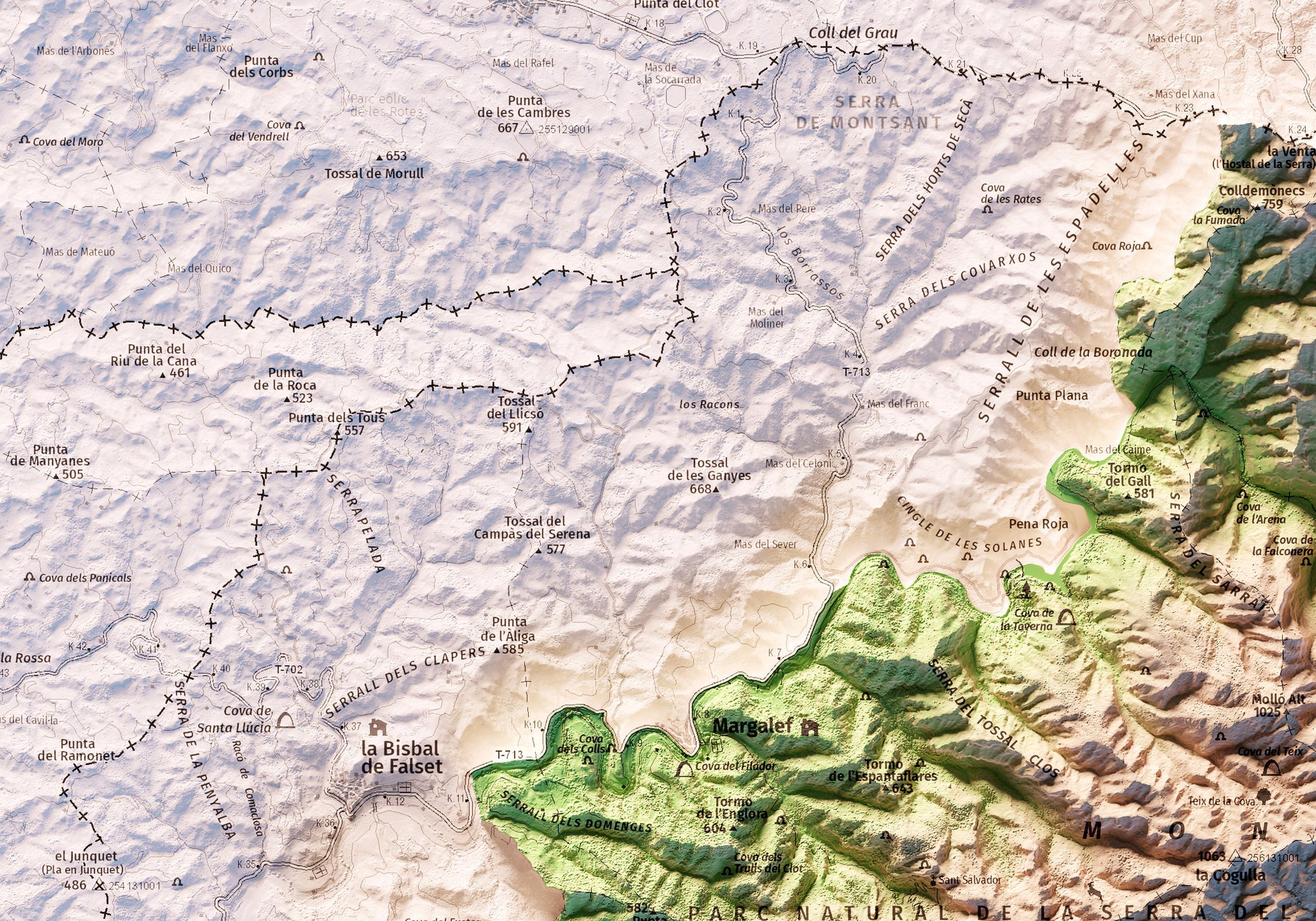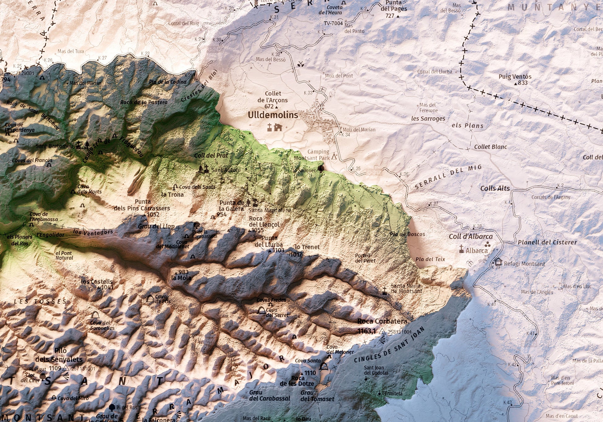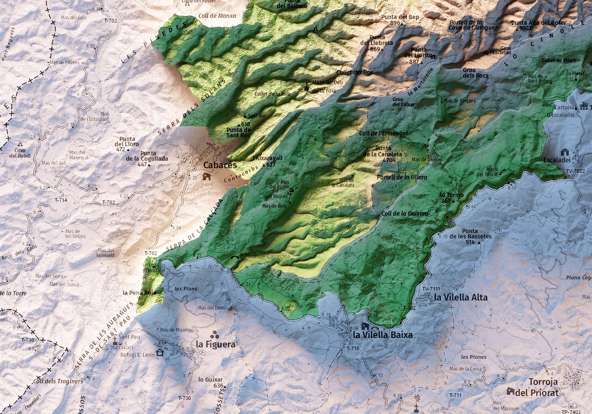 Mapa topográfico en color de la serra de Montsant.