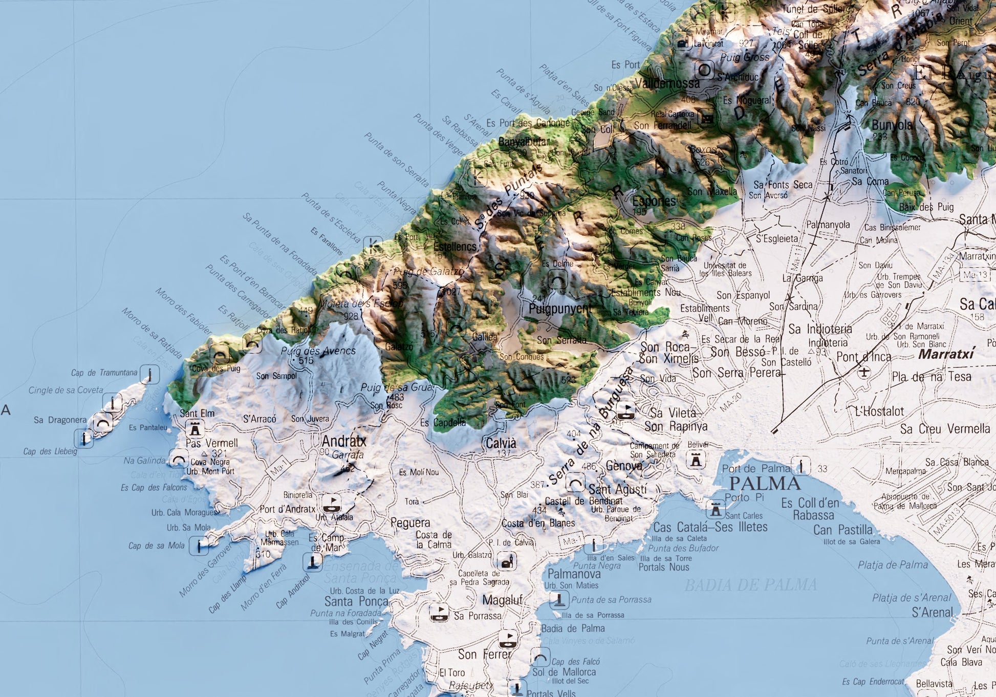 Mapa topográfico en color de la Serra de Tramuntana en Mallorca.