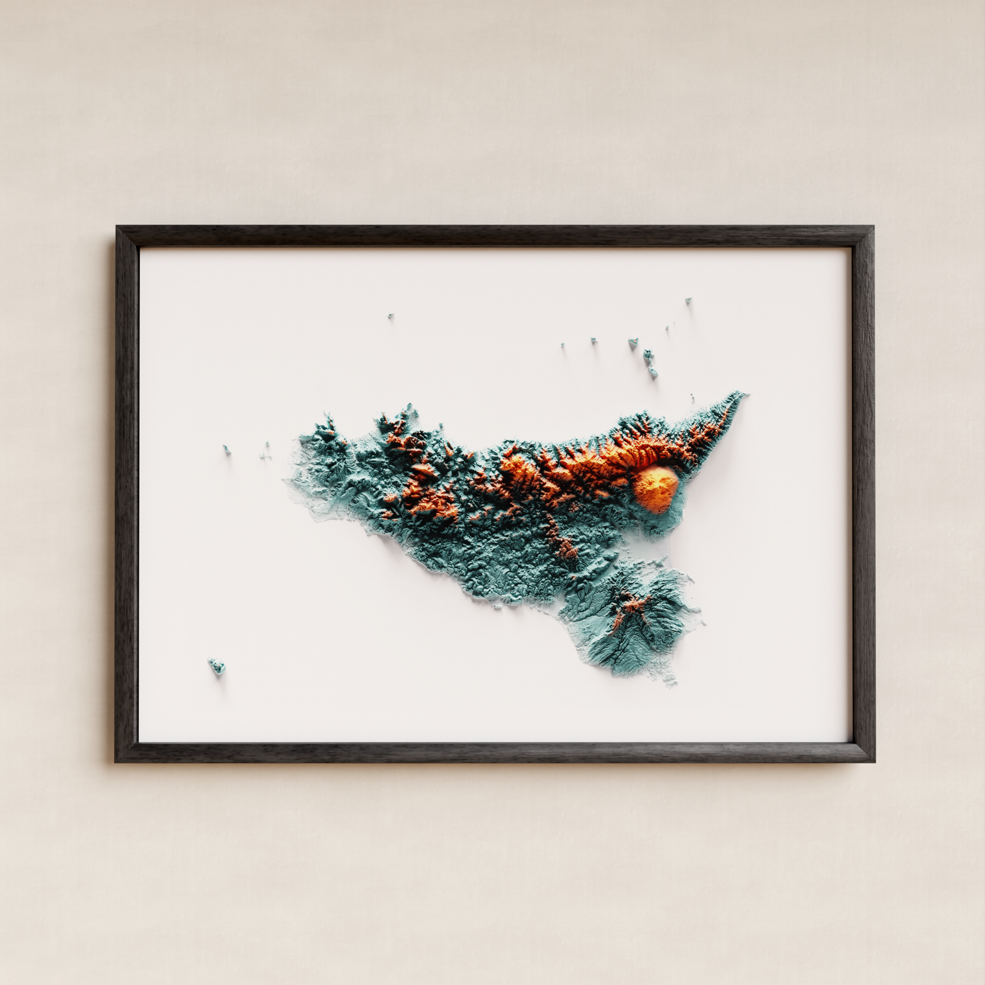 Abraza los colores vibrantes y los paisajes dramáticos de la región de Sicilia con nuestra impresión de mapa de ayuda de contraste, y deja que sea un recordatorio constante de la increíble belleza de Italia.
